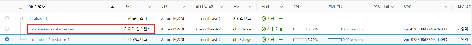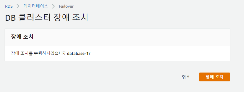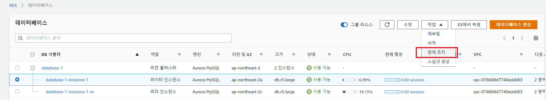 -. 위와 같이 Cluster 구성에서 라이터 인스턴스 / 리더 인스턴스로 구성되어 있는 경우, 라이터 인스턴스 클릭 후 장애 조치를 클릭한다.