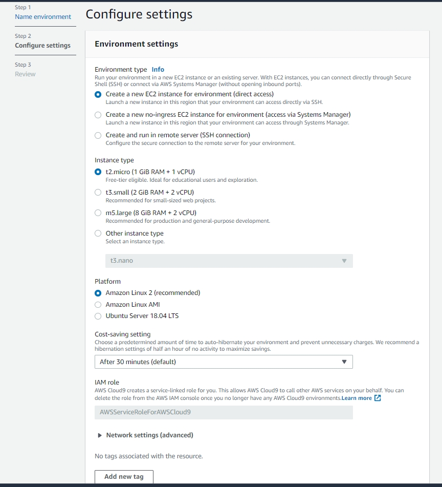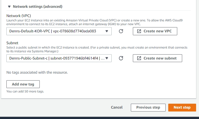 Cloud9 환경을 생성하면 EC2도 생성되는데, 생성되는 EC2가 어떤 VPC, Subnet에 위치할 지 설정할 수 있습니다.