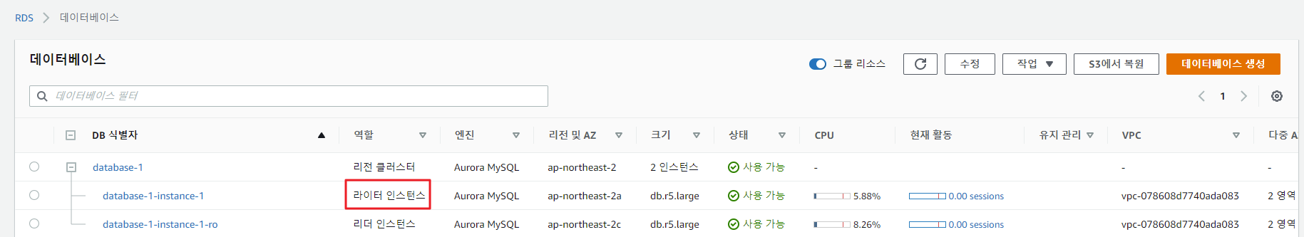 작업은 수분내로 종료되며, ro가 붙은 인스턴스가 라이터 인스턴스로 변경