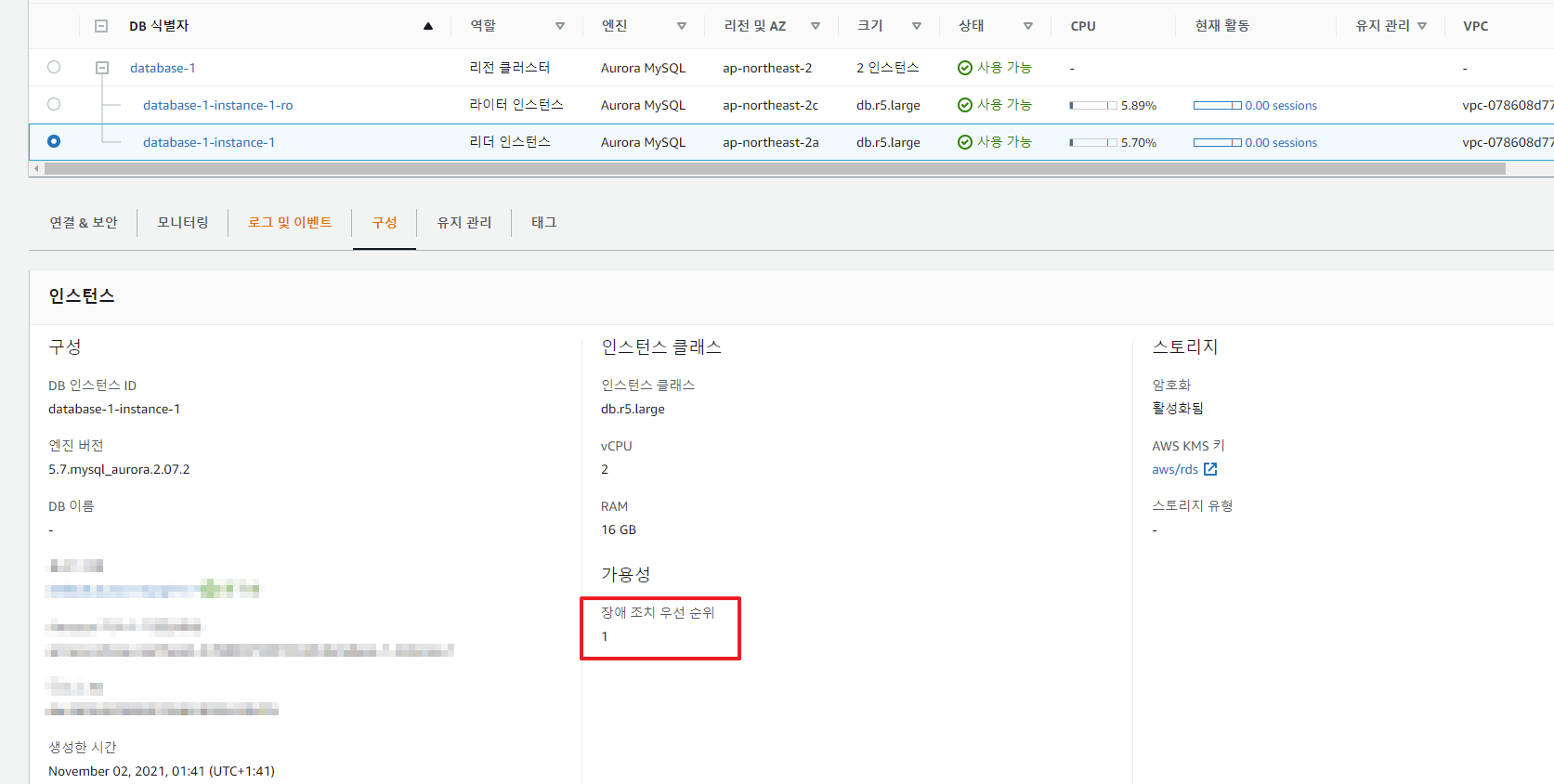 -. 리더 인스턴스를 클릭하여, '장애 조치 우선 순위' 값을 변경해줄 수 있음.