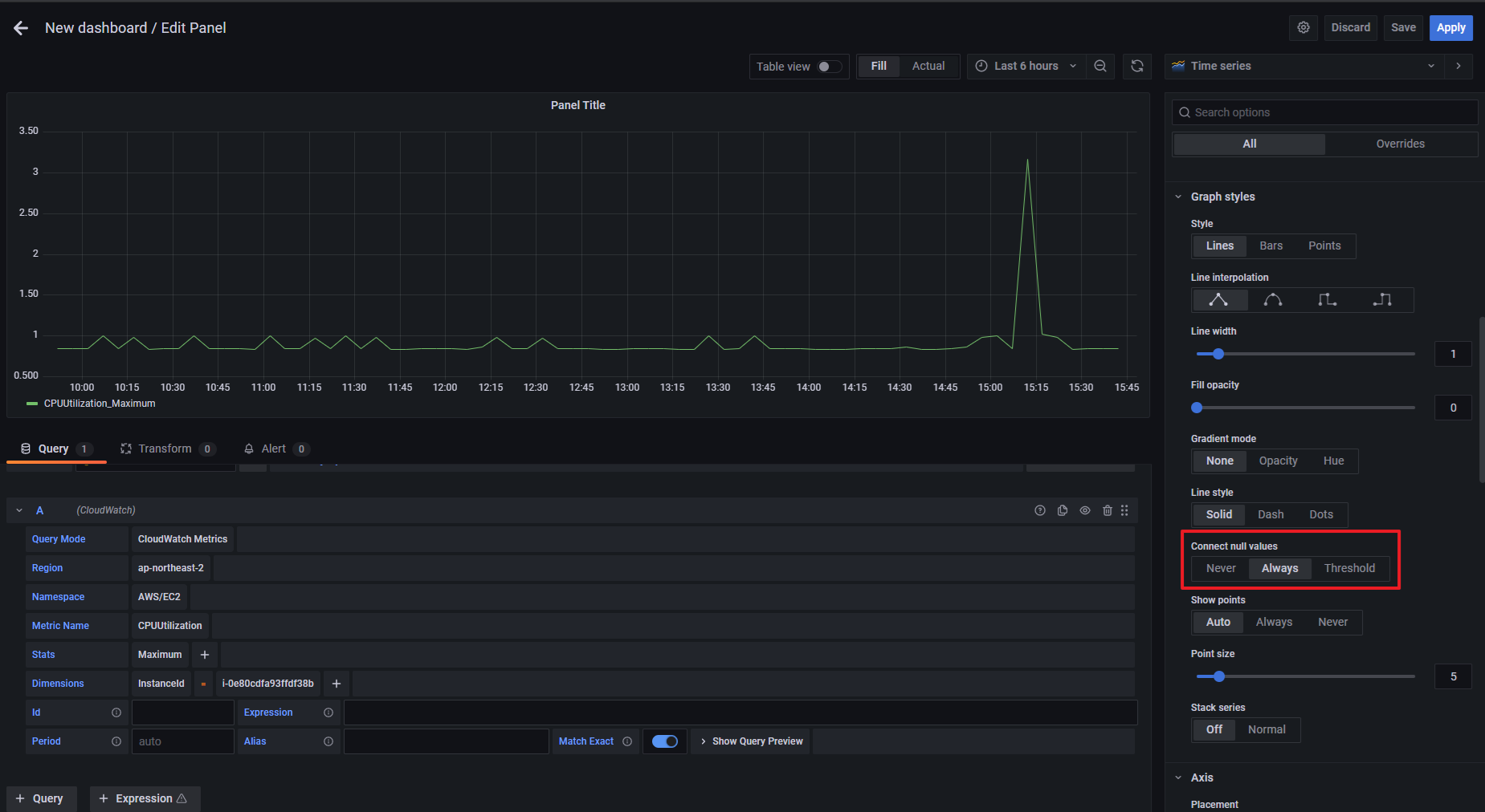 Connect null value에서 'Always' 선택하면 위와 같이 우리가 아는 그래프로 출력됩니다.
