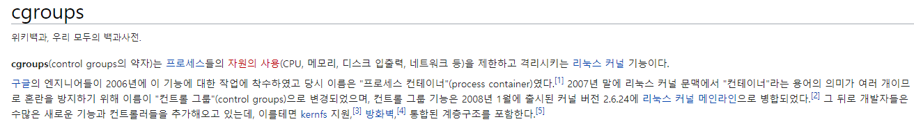 -. 리눅스에서는 Docker 이전에 cgroup를 통해 process를 격리하는 방법을 사용하였음. 이는 Docker의 개념과 유사함.(Linux Container a.k.a LXC)