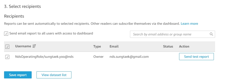 QuickSight 대시보드를 다 만들었다면 Report 기능을 활용할 수 있음.