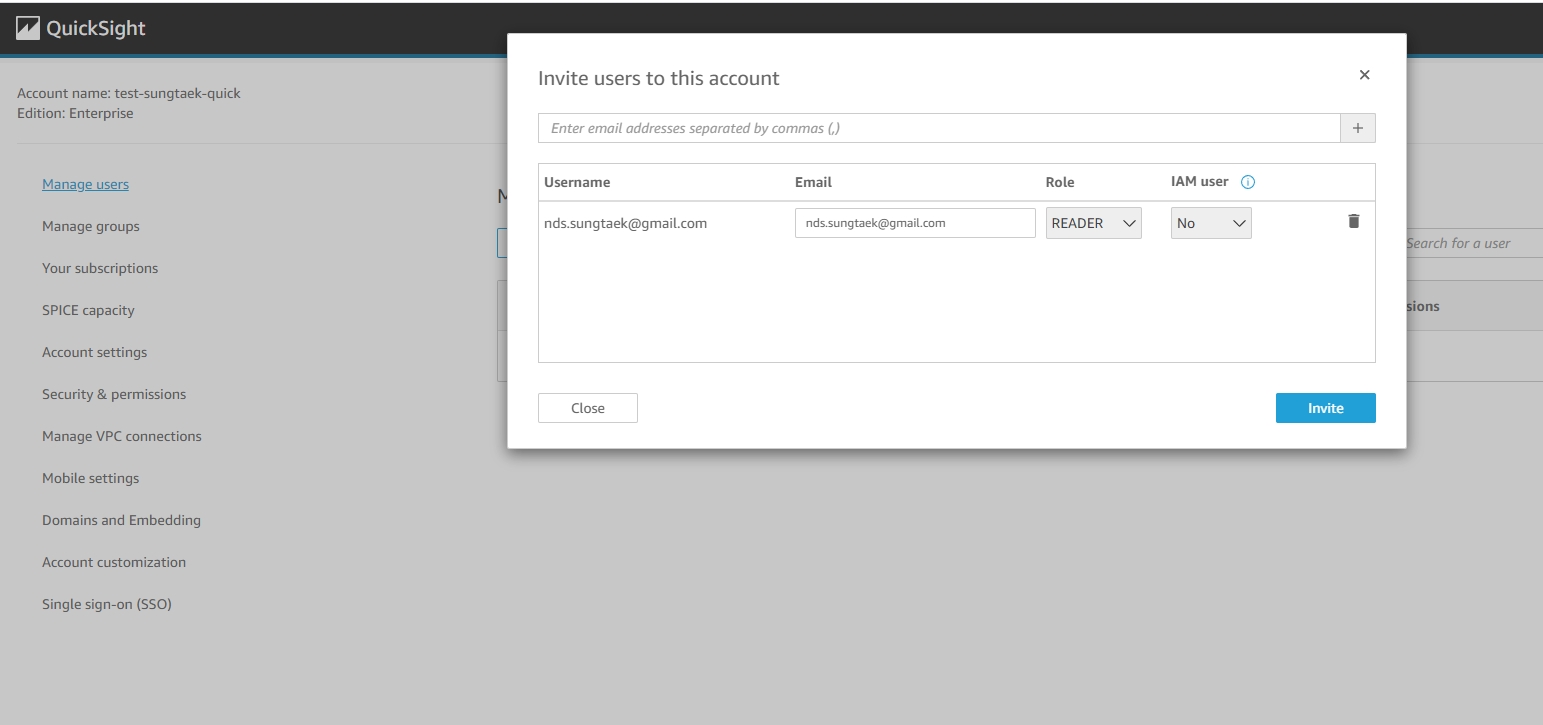 AWS 콘솔에 로그인해서 QuickSight를 사용하더라도, QuickSight용 Account를 만들어야한다.