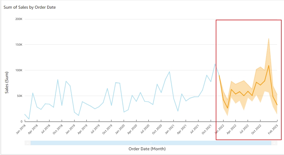 실제 해당 데이터는 2021년 12월까지만 있던 데이터지만, 'Forecast' 기능을 활용하면 해당 그래프와 같이 예측 데이터가 출력됩니다.