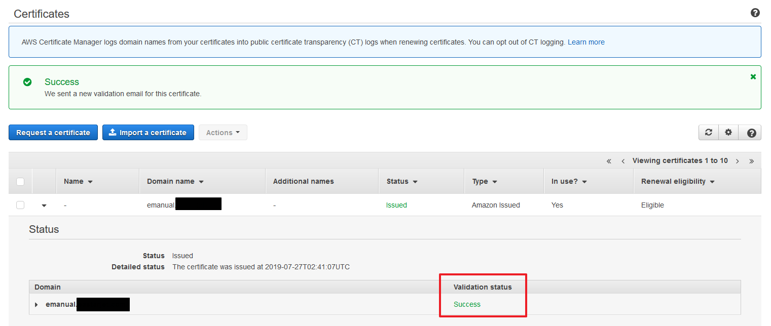 Certificate Manager를 들어가면 SSL 인증서를 확인할 수 있으며, 해당 화면의 'Type'에 Amazon Issued 라고 되어있는 것은 아마존에서 발급받았다는 것을 의미. 외부 인증서의 경우 'Imported'로 표기됨.