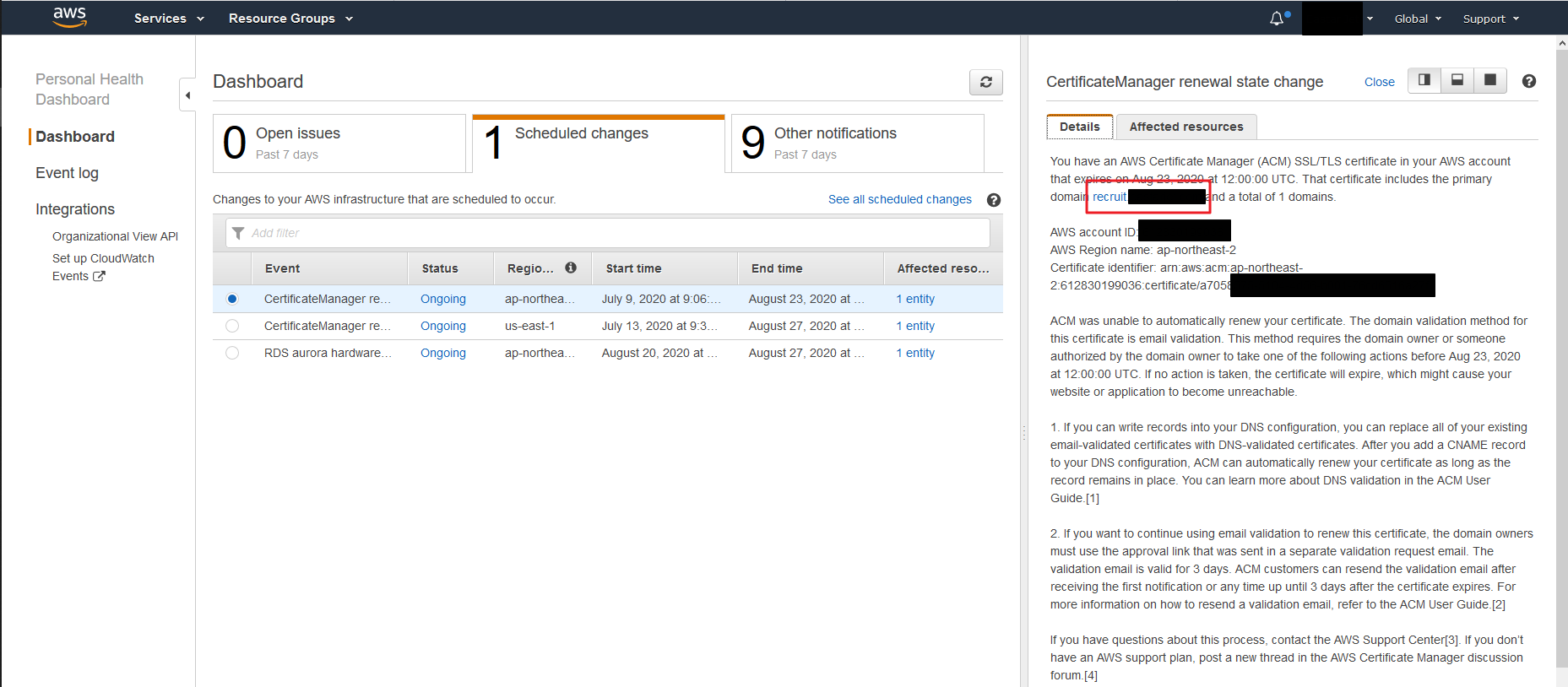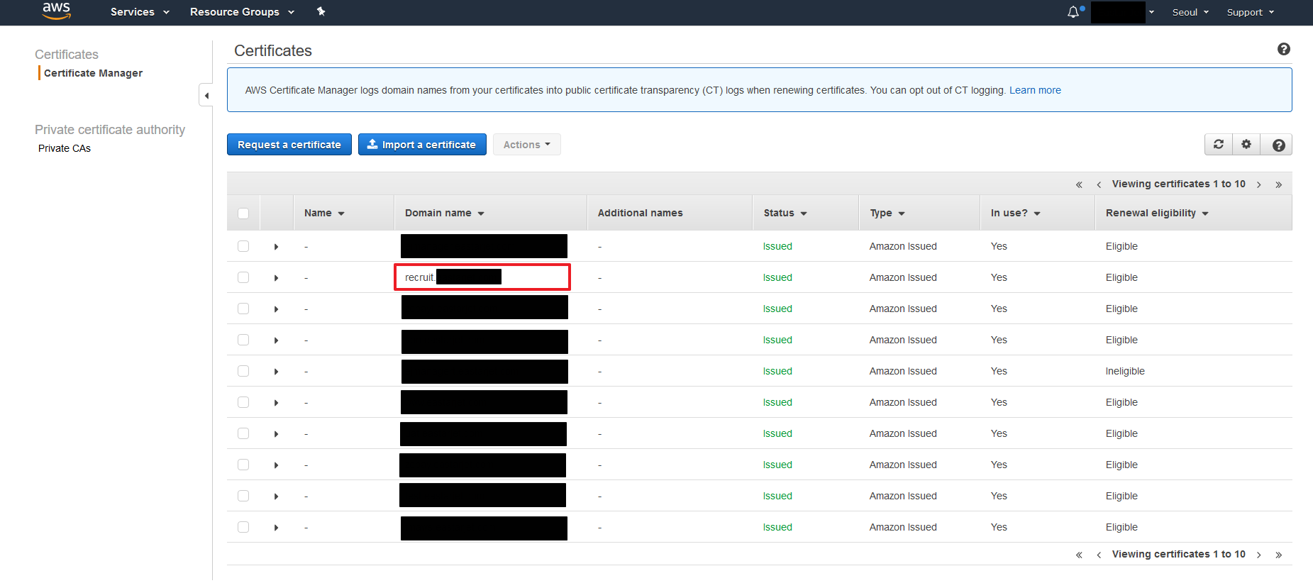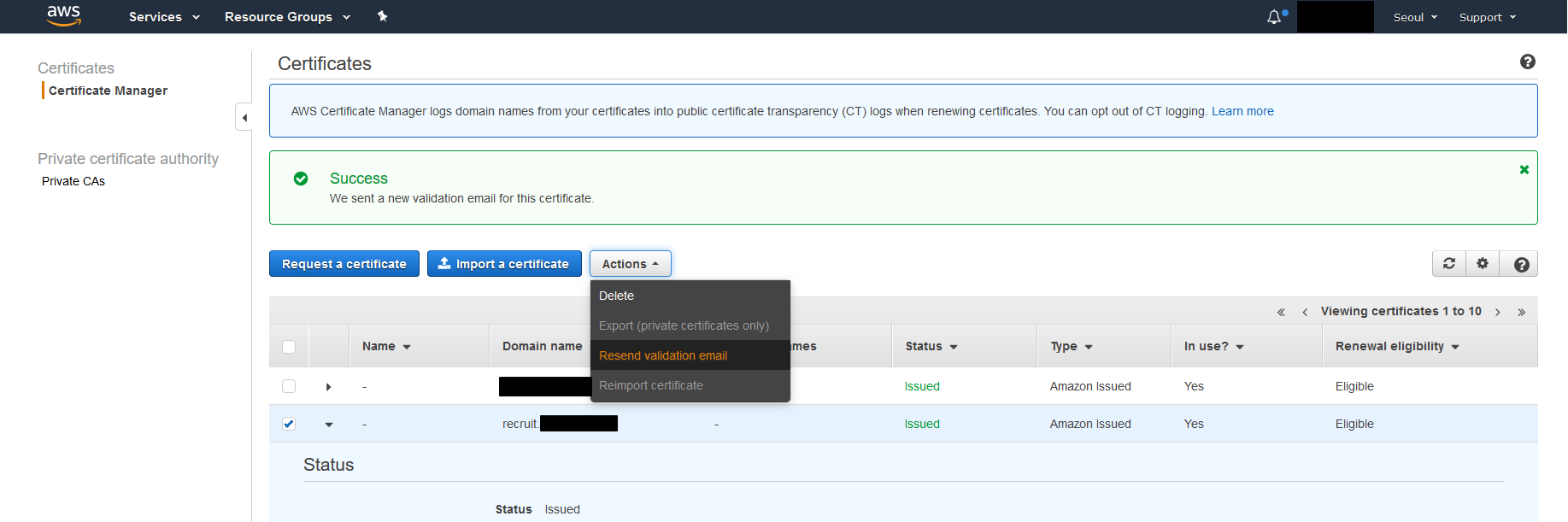 - 이메일을 수신하면 위의 내용으로 메일을 받으며, Certificate Manager의 경우 글로벌 서비스가 아니라 인증서가 있는 지역을 선택. 예시 도메인은 'ap-northeast-2' 이므로, 서울 지역에 있음.
