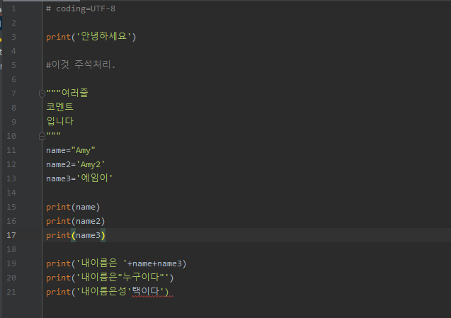""" 세번의 "를 통해 여러줄 주석처리 가능. 마지막은 """로 닫아줘야함. // Lin7~10