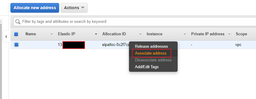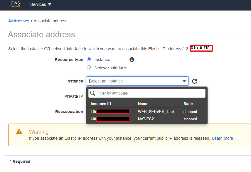 할당받은 EIP와 Instance ID를 연결해주자.. Instance의 Name을 통해 입력해줘도 되고, Private IP를 입력해줘도 되니 편할대로 하면 된다.