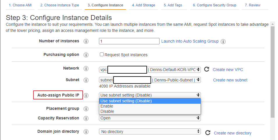 - Auto-assign Public IP를 기본 설정으로 둔다. 'Use subnet setting(Disable)'